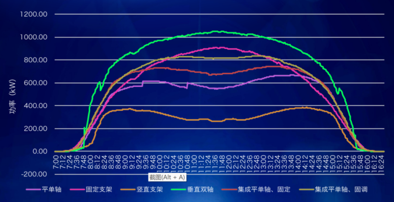 針對(duì)以上特性,不同支架與雙面組件、逆變器組合得出不同功率曲線,目前以固定支架為主的設(shè)計(jì)方案功率曲線在高輻照下功率最大,需研究通過不同支架、不同逆變器、不同組件等各種組合方式實(shí)現(xiàn)光伏電站自身錯(cuò)峰運(yùn)行。隨著并網(wǎng)光伏電站規(guī)模越來越大,光伏電站設(shè)計(jì)過程中要結(jié)合當(dāng)?shù)赜秒娯?fù)荷特性,對(duì)設(shè)備選型、組合方案進(jìn)行比選,提出適用于當(dāng)?shù)刎?fù)荷特性的光伏電站設(shè)計(jì)方案。