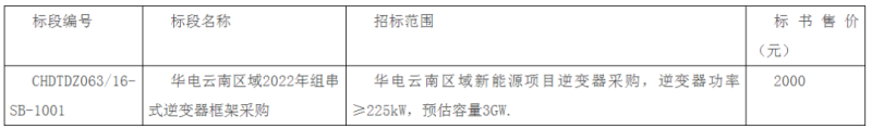 根據(jù)招標(biāo)公告,華電云南區(qū)域2022年組串式逆變器框架采購要求逆變器功率≥225kW,預(yù)估容量3GW。