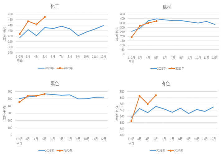 5月份,化工行業(yè)用電量470億千瓦時,同比增長5.4%;建材行業(yè)用電量373億千瓦時,同比下降6.6%;黑色金屬冶煉行業(yè)用電量566億千瓦時,同比下降2.0%;有色金屬冶煉行業(yè)用電量608億千瓦時,同比增長2.7%。