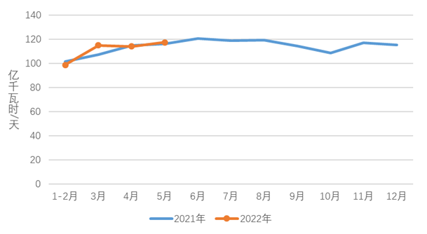 1-5月,化工行業(yè)用電量2229億千瓦時,同比增長5.0%;建材行業(yè)用電量1524億千瓦時,同比下降4.2%;黑色金屬冶煉行業(yè)用電量2615億千瓦時,同比下降2.5%;有色金屬冶煉行業(yè)用電量2910億千瓦時,同比增長1.8%。