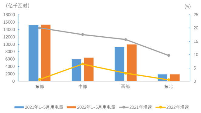 1-5月,東、中、西部和東北地區(qū)②全社會用電量分別為15271、6377、9993和1884億千瓦時,增速分別為0.7%、6.5%、3.1%和0.6%。