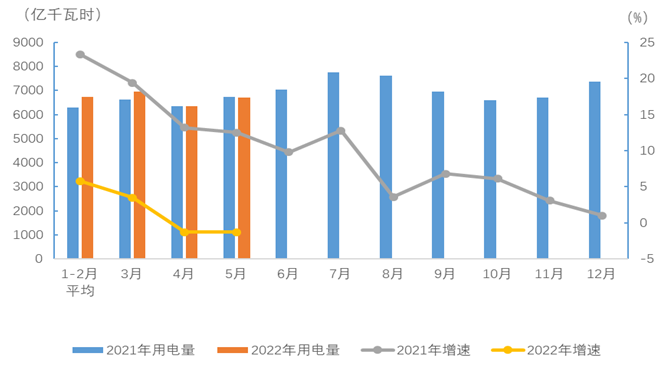 圖1 2021、2022年分月全社會用電量及其增速