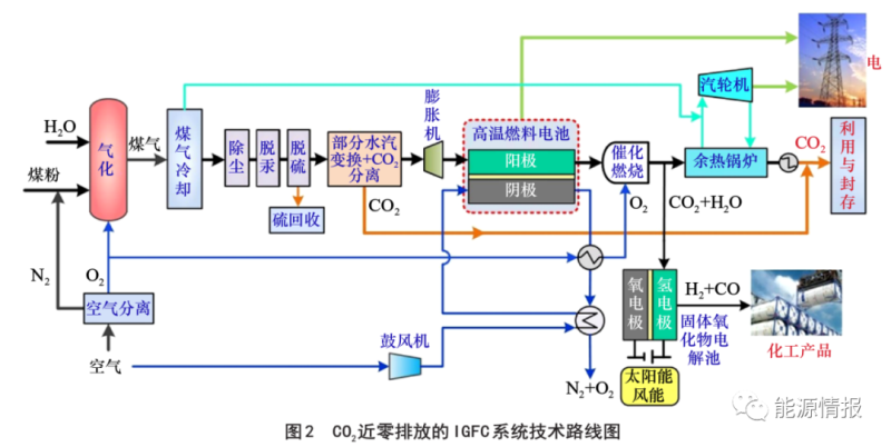 在固體氧化物燃料電池技術(shù)應(yīng)用場景方面,IGFC 技術(shù)有助于實(shí)現(xiàn)煤炭的清潔高效利用,是煤炭領(lǐng)域的變革性技術(shù)。為推進(jìn) IGFC 相關(guān)技術(shù)攻關(guān)和工程示范,科學(xué)技術(shù)部在2017年立項(xiàng)了國家重點(diǎn)研發(fā)計(jì)劃 “CO2近零排放的煤氣化發(fā)電技術(shù)”,由國家能源集團(tuán)牽頭,聯(lián)合中國礦業(yè)大學(xué)(北京)、中國華能集團(tuán)清潔能源技術(shù)研究院有限公司、清華大學(xué)等單位組成“產(chǎn)學(xué)研”攻關(guān)團(tuán)隊(duì),其核心任務(wù)是開發(fā)高溫固體氧化物燃料電池和固體氧化物電解池(SOEC)技術(shù),建成CO2近零排放的IGFC示范工程,項(xiàng)目總體技術(shù)路線如圖2所示。IGFC系統(tǒng)一般由煤氣化凈化、高溫燃料電池發(fā)電、余熱回收及CO2捕集和封存等子系統(tǒng)構(gòu)成,其中高溫燃料電池發(fā)電技術(shù)是制約 IGFC 發(fā)展的關(guān)鍵技術(shù)。項(xiàng)目組目前已開發(fā)了固體氧化物燃料電池電堆和 IGFC 測試平臺,已實(shí)現(xiàn)了 20 千瓦級 IGFC 發(fā)電系統(tǒng)試車,下一步將依托已有技術(shù)開展 100 千瓦級 IGFC 發(fā)電系統(tǒng)示范。目前,國內(nèi) IGFC 仍處于起步階段,煤氣凈化提純技術(shù)、高溫燃料電池技術(shù)、系統(tǒng)耦合控制技術(shù)等相關(guān)技術(shù)研究正逐步開展。高溫固體氧化物燃料電池技術(shù)是制約 IGFC 發(fā)展的關(guān)鍵技術(shù),目前,國內(nèi)的固體氧化物燃料電池技術(shù)尚未完全成熟,一方面應(yīng)加強(qiáng)基礎(chǔ)研究,另一方面要重點(diǎn)開展關(guān)鍵技術(shù)攻關(guān),降低成本,提高壽命。