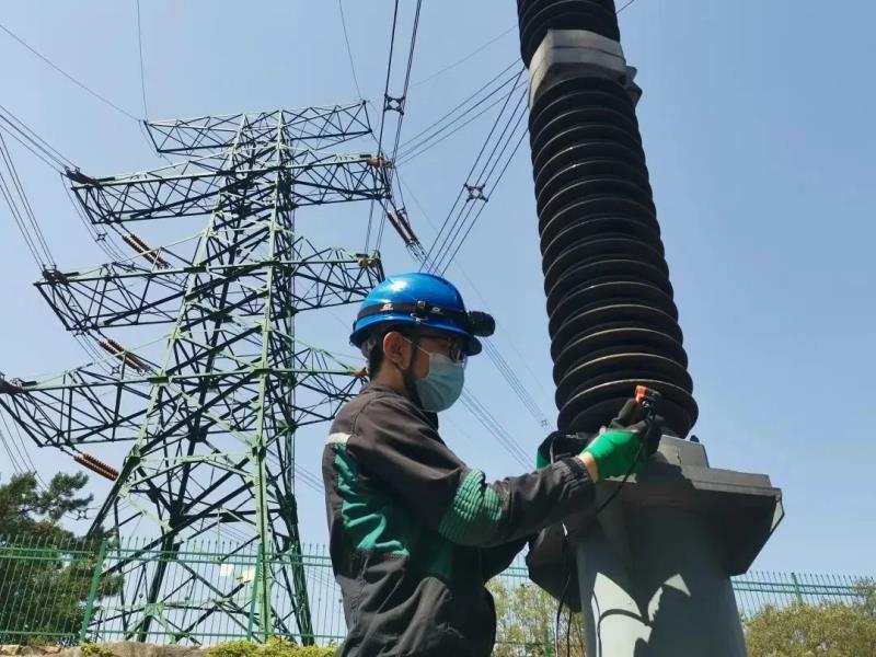 檢修公司天津分部金屬檢測班班長在泰安電站220千伏出線場對支柱瓷絕緣子進行超聲檢測