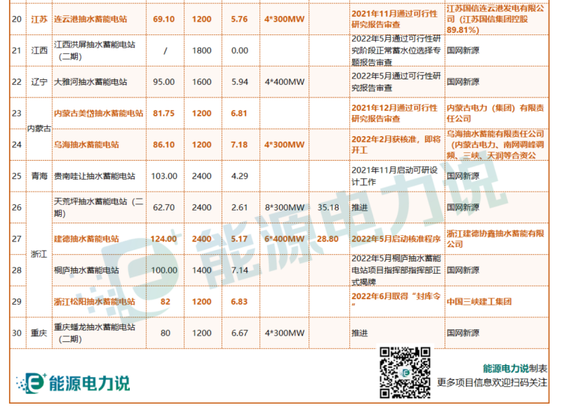 30個(gè)推進(jìn)中抽水蓄能電站名單如下 :