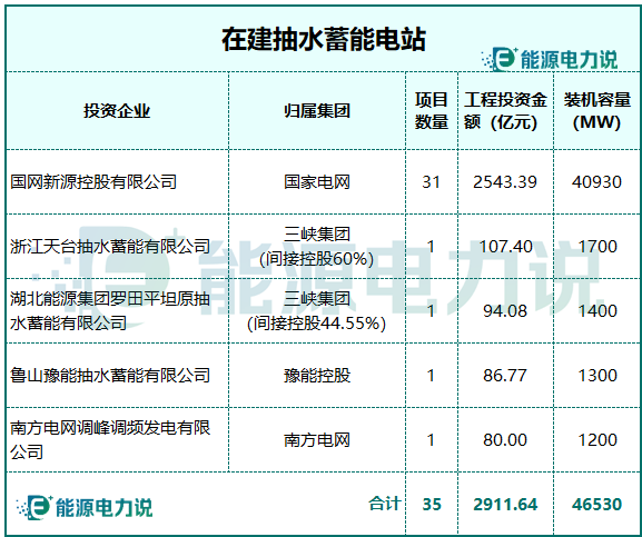 能源電力說(shuō)統(tǒng)計(jì)了截止目前35個(gè)在建抽水蓄能項(xiàng)目,設(shè)計(jì)投資金額超2900億元,總?cè)萘恳?guī)模達(dá)到46.5GW。