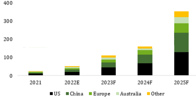 2021~2022年全球各地市場部署的儲(chǔ)能系統(tǒng)預(yù)測(GWh)
