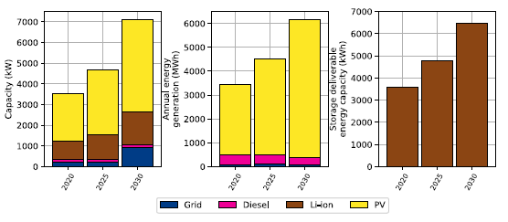 在研究團(tuán)隊(duì)的案例研究中,研究團(tuán)隊(duì)使用尼日利亞首都阿布賈市Wuse市場的負(fù)載曲線作為參考。Wuse市場是一個當(dāng)?shù)氐穆短焐唐泛褪称肥袌?,?,155家商鋪,并在2019年產(chǎn)生了993kW的峰值需求。這個峰值通常發(fā)生在下午1點(diǎn)到4點(diǎn)之間。當(dāng)市場在晚上關(guān)閉時(shí),負(fù)載大幅減少(能耗主要來自共用的冷藏室)。2018年Wuse市場負(fù)載能耗占電網(wǎng)總需求的10%。使用上述方法,研究團(tuán)隊(duì)對該市場采用的太陽能發(fā)電設(shè)施和鋰離子電池儲能系統(tǒng)的發(fā)電系統(tǒng)的成本優(yōu)化設(shè)計(jì)進(jìn)行建模,考慮到第三方發(fā)電設(shè)施的費(fèi)用和柴油發(fā)電機(jī)成本,以及預(yù)計(jì)到2030年Wuse市場的電力需求增長。研究團(tuán)隊(duì)發(fā)現(xiàn),在這些假設(shè)下,成本最優(yōu)的發(fā)電組合主要來自太陽能系統(tǒng)和電池儲能系統(tǒng),可以將供電服務(wù)延長到下午晚些時(shí)候。圖7.19展示了研究團(tuán)隊(duì)的參考案例結(jié)果,其中電網(wǎng)供應(yīng)可用性對應(yīng)于AEDC公司對2020年和2025年期間計(jì)劃電網(wǎng)中斷的預(yù)測。預(yù)計(jì)到2030年將不會出現(xiàn)電網(wǎng)中斷的情況。