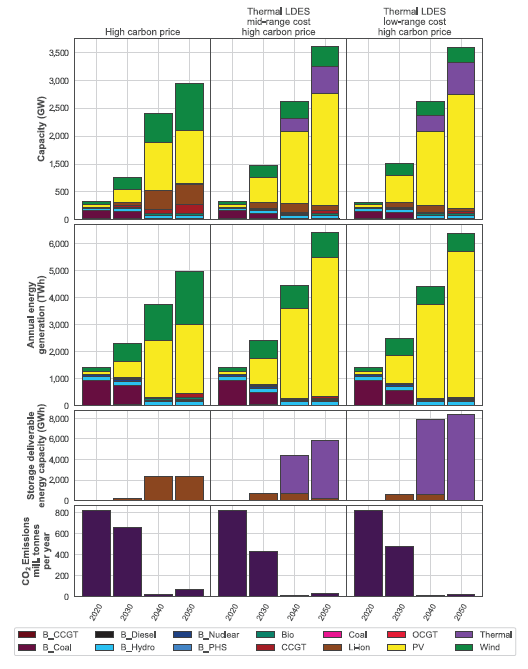 第6章中介紹的美國幾個地區(qū)的模型結(jié)果,以及作為研究團(tuán)隊(duì)在本章第7.2.3節(jié)中評估分布式儲能系統(tǒng)影響的一部分討論的低成本鋰離子電池儲能方案,強(qiáng)調(diào)了獲得低成本的鋰離子電池的重要性,從而用于電網(wǎng)脫碳。預(yù)期電池成本的下降趨勢,尤其是長時(shí)儲能的成本下降也很重要。在這里,研究團(tuán)隊(duì)探討了從2040年開始的長時(shí)儲能技術(shù)的可用性如何影響印度電力系統(tǒng)的發(fā)展。在研究團(tuán)隊(duì)的分析中,使用熱儲能作為長時(shí)儲能的代表技術(shù),并檢查其在不同碳排放政策情景下的作用,包括假設(shè)沒有碳排放政策的參考案例和碳價(jià)格從2030年的20美元/噸上漲到接近的情景到2050年的50美元/噸。研究團(tuán)隊(duì)還考慮了長時(shí)儲能在替代成本和性能假設(shè)下的作用(即中低端成本假設(shè),在2040年和2050年保持不變)。