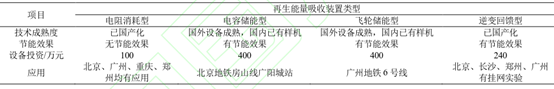地鐵能量回收是一種大功率、高頻次的應(yīng)用場景,目前應(yīng)用較為廣泛的是再生制動能量吸收利用。當(dāng)制動能量不能被本車吸收時,牽引網(wǎng)電壓上升,上升到一定程度后,牽引變電所中再生制動能量吸收裝置投入工作,吸收再生電流,使車輛再生電流穩(wěn)定。目前,再生能量吸收裝置可分為電阻消耗型、電容儲能型、飛輪儲能型、逆變回饋型,各類型裝置對比如表所示。目前電容儲能型和飛輪儲能型較為常用。