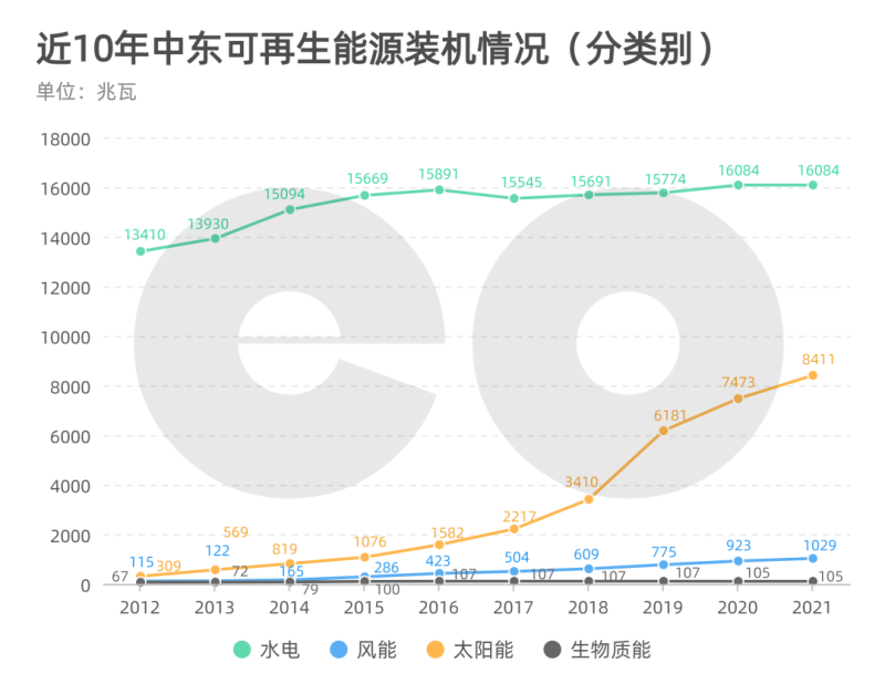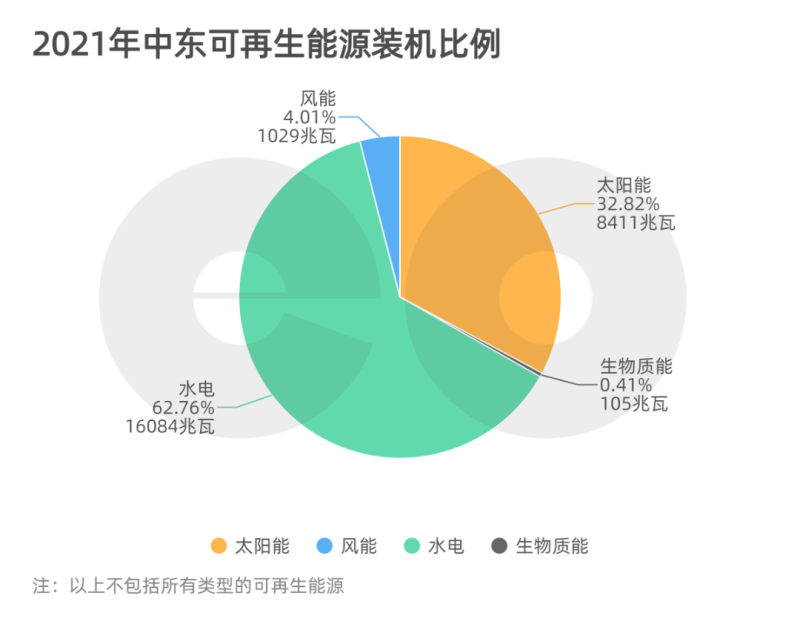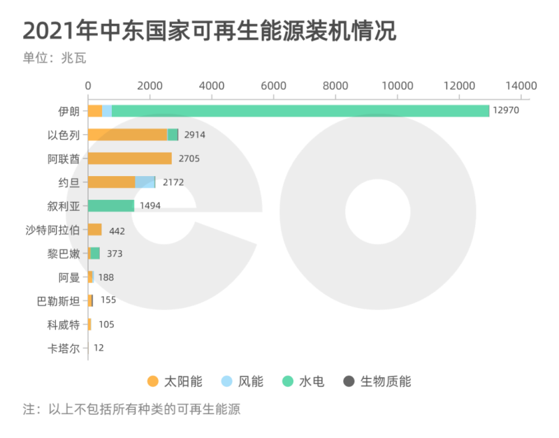 水電穩(wěn)定占據(jù)中東可再生能源的最大比重,2021年裝機(jī)容量約為16吉瓦,占比超過六成。太陽能發(fā)電為近10年中東發(fā)展速度最快的可再生能源,2021年的裝機(jī)容量比2012年增長了26倍,增加了8102兆瓦。科威特、巴勒斯坦、阿曼、沙特阿拉伯、約旦、阿聯(lián)酋、以色列等國的太陽能發(fā)電裝機(jī)容量占據(jù)四種主要可再生能源裝機(jī)總量的一半以上,其中沙特、阿聯(lián)酋占比接近100%。