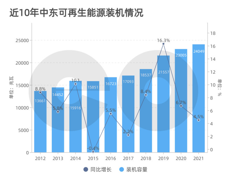 中東可再生能源規(guī)模較小,發(fā)展速度較慢。2021年其裝機(jī)容量約24吉瓦,約占全球可再生能源裝機(jī)總量的0.8%。2012—2021年中東可再生能源裝機(jī)容量增長約10.4吉瓦,增幅為76%,年均增速約為6.8%。