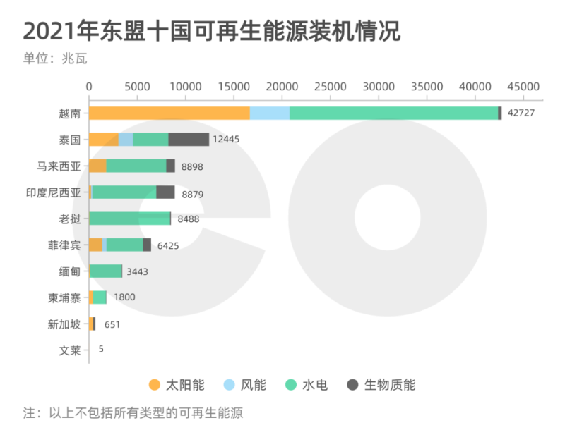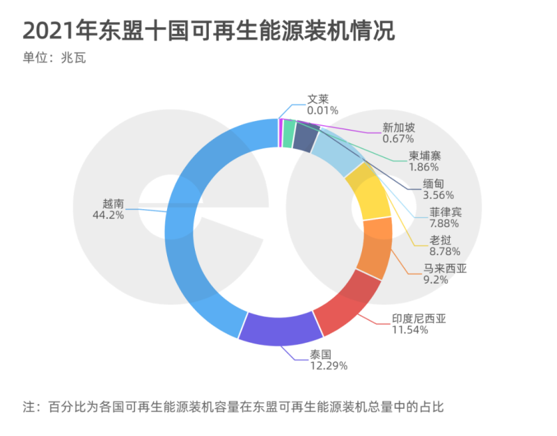 從國別看,2021年可再生能源裝機(jī)規(guī)模前三的東盟國家依次是越南、泰國和印度尼西亞,在東盟中的占比分別為44.2%、12.29%和11.54%。文萊、新加坡、柬埔寨規(guī)模小,三者總和在東盟中的占比不到3%。