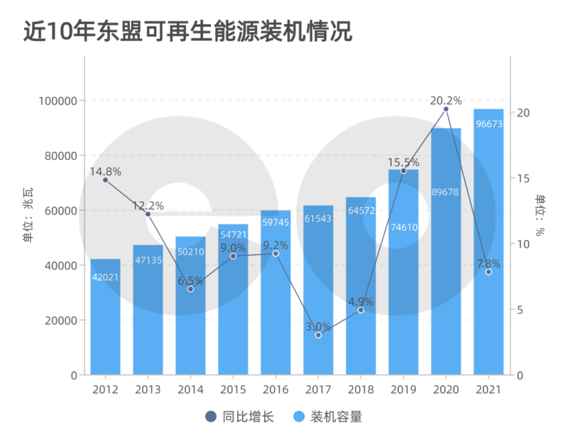 近10年東盟可再生能源發(fā)展迅速,2012—2021年裝機(jī)容量增長了約54.7吉瓦,10年間增長了1.3倍,年均增速約為10.3%。2021年,東盟可再生能源裝機(jī)容量約97吉瓦,占亞洲可再生能源裝機(jī)總量的6.6%,占全球總?cè)萘康?.2%。