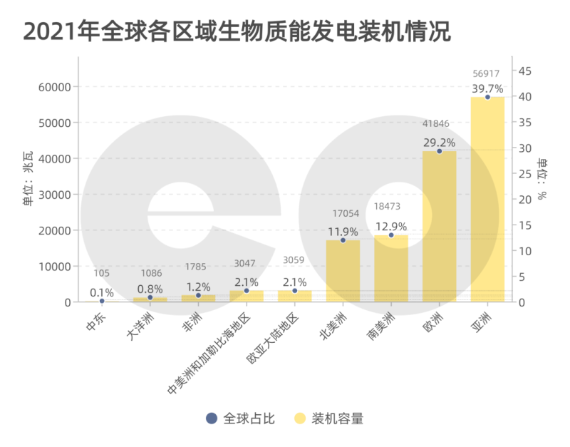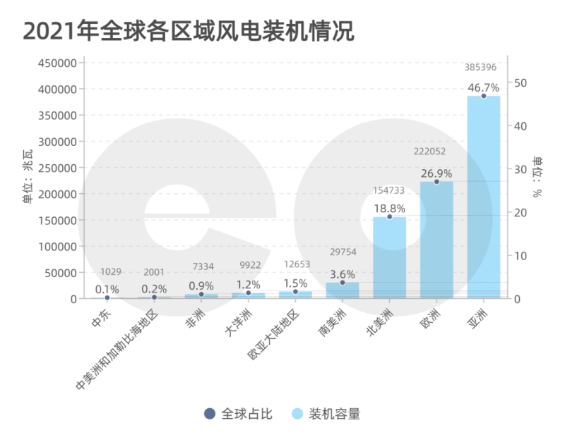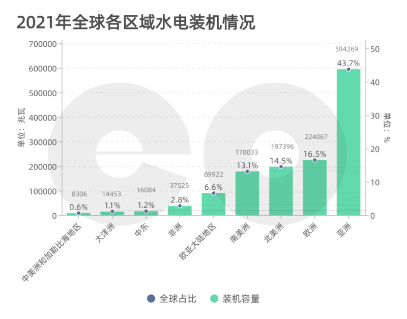 從區(qū)域看,亞洲、歐洲可再生能源發(fā)展領(lǐng)先全球,兩者的裝機(jī)容量占全球總?cè)萘拷叱?。亞洲水電、風(fēng)能、太陽能、生物質(zhì)能等裝機(jī)容量均居世界首位,全球占比分別為43.7%、46.7%、57.2%和39.7%。