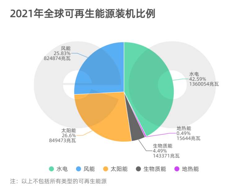 IRENA數(shù)據(jù)顯示,截至2021年底,全球可再生能源裝機(jī)容量約3064吉瓦,占全球總發(fā)電裝機(jī)容量的38%。2021年,全球新增可再生能源裝機(jī)容量約257吉瓦,同比增長9.1%,占當(dāng)年發(fā)電裝機(jī)增量的81%。