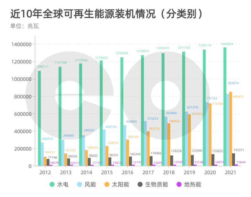 從可再生能源種類看,近10年,全球水電增長平穩(wěn),太陽能發(fā)電發(fā)展迅猛,2012—2021年太陽能發(fā)電裝機(jī)容量增長了7倍,同期風(fēng)電增長了2倍。2021年,全球新增可再生能源裝機(jī)容量約257吉瓦,其中太陽能發(fā)電新增約133吉瓦,占比約51.7%,風(fēng)電新增約93吉瓦,占比約36%。2021年,風(fēng)能和太陽能發(fā)電裝機(jī)容量占全球可再生能源裝機(jī)總量的一半以上。