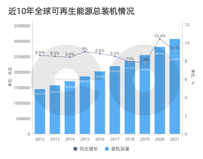 2012—2021年,全球新增可再生能源裝機(jī)容量約1620吉瓦,10年間增長超1倍,年均增速約為8.7%。2020年增速最大,達(dá)10.4%。