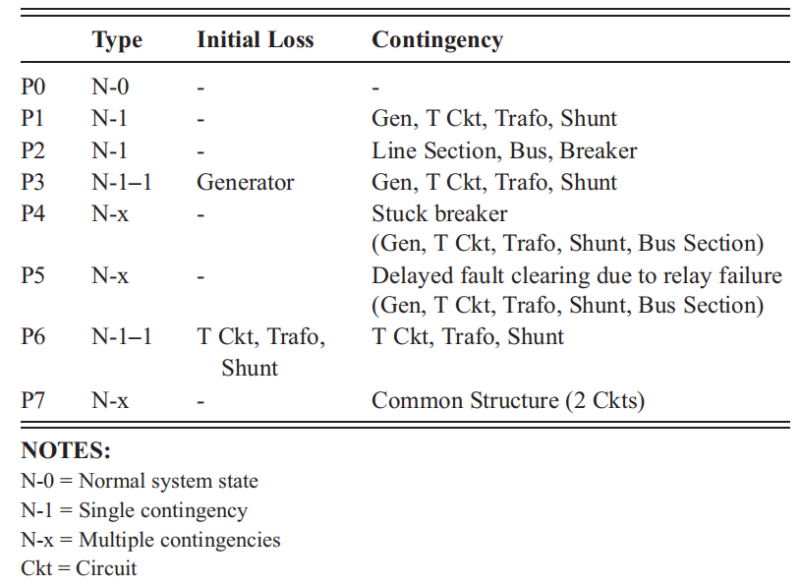 輸電網(wǎng)規(guī)劃必須符合最低的性能標準,例如北美的 NERC TPL-001-4。性能要求確保在規(guī)劃范圍內(nèi),大容量電力系統(tǒng) (BES) 將在廣泛的系統(tǒng)條件下可靠運行,并遵循表 1.1 中總結(jié)的各種可能的突發(fā)事件。根據(jù) NERC TPL-001-4 標準的應(yīng)急分類可以總結(jié)如下:P0 是完整系統(tǒng)(N-0);P1為單一元件失效(電路、發(fā)電機、變壓器、分流裝置);P2也是單一元件失效(線路分段、母線、斷路器);P3是發(fā)電機失效一段時間后第二個元件失效(N-1-1),P4是多元件失效(斷路器拒動),P5也是多元件失效(繼電保護故障清除延遲)失效); P6 是單個元件(線路、變壓器、分流裝置)失效后的另一個單個元件(N-1-1)失效,P7 是多個元件(一般結(jié)構(gòu))的失效。