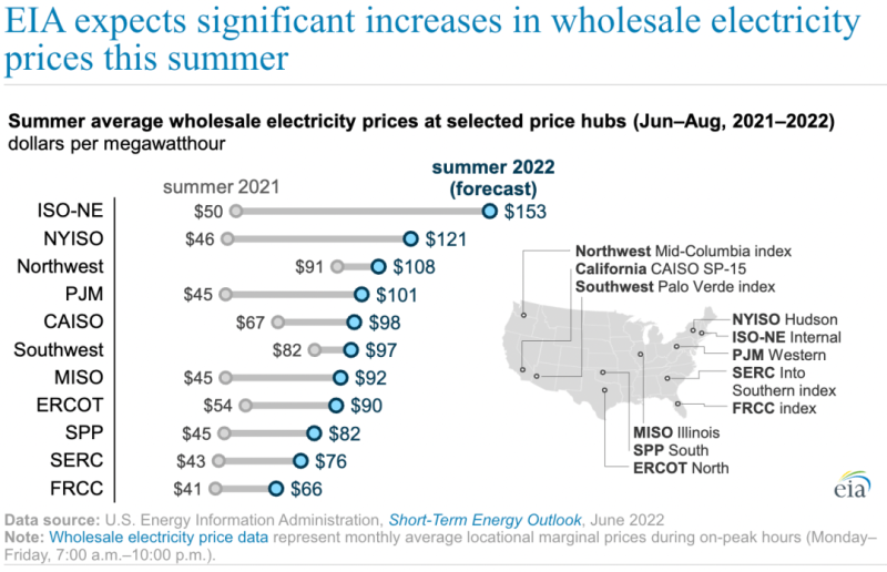 中國儲(chǔ)能網(wǎng)訊:在美國能源信息署(EIA)的短期能源展望報(bào)告中,預(yù)計(jì)今年夏天批發(fā)電力市場的價(jià)格將比去年夏天大幅上漲。2022年6月至8月,東北地區(qū)(ISO新英格蘭、紐約ISO和PJM市場)的電價(jià)將超過100美元/兆瓦時(shí)(MWh),而去年夏天的平均價(jià)格約為50美元/兆瓦時(shí);加州CAISO市場的夏季電價(jià)平均為98美元/兆瓦時(shí),德克薩斯州ERCOT市場的夏季電價(jià)平均為90美元/兆瓦時(shí)。