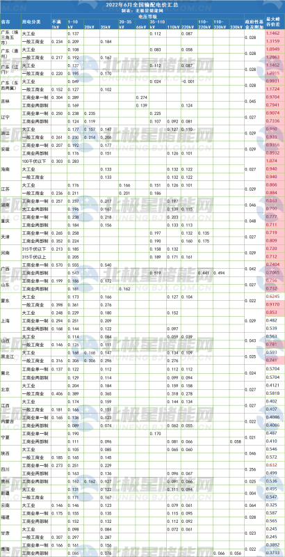根據(jù)2022年6月全國各地電網(wǎng)企業(yè)代理購電價格,北極星儲能網(wǎng)梳理了全國各地110kV大工業(yè)電價兩部制電價中的輸配電價和政府性基金及附加發(fā)現(xiàn),每個省份的輸配電價并不一致,并且根據(jù)當?shù)厍闆r與季節(jié)會發(fā)生波動。