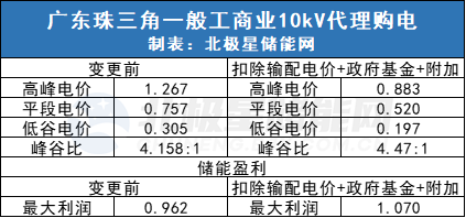 以廣東珠三角地區(qū)為例,一般工商業(yè)10kV輸配電價0.2094元/kWh,政府性基金及附加0.0276元/kWh,如果相應充電電量不承擔輸配電價和政府性基金及附加,則平段電價達到0.5197元/kWh,與此同時,高峰低谷電價按當?shù)卣弑壤齽t變成0.883元/kWh、0.197元/kWh。電價峰谷比由原來的4.158:1,變成4.47:1,峰谷比拉大。