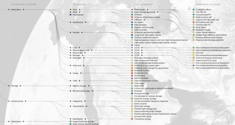 放大局部,比如發(fā)電技術,分為太陽能,風能,水電,地熱,核能,煤炭,天然氣、生物質(zhì)、天然氣等等。風電子技術又分為陸上,海上,Airbone風能系統(tǒng)等。海上風電還可以繼續(xù)分出固定基礎、漂浮式基礎和漂浮式混合平臺等。非常翔實。