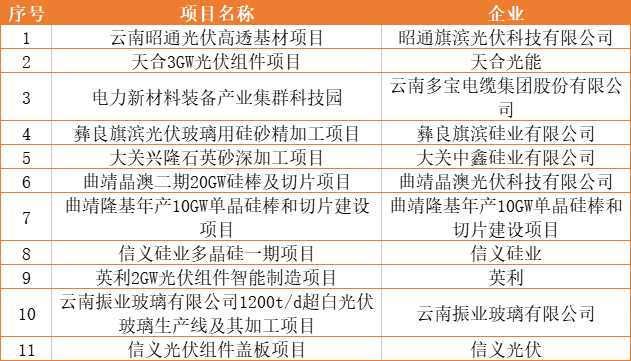 除光伏電站項目外,云南2022年度重大項目還涉及一批光伏制造業(yè),包括光伏玻璃、硅料、組件、硅片、切片、電纜、蓋板等一系列項目,主要投資方有信義光能、隆基、晶澳、天合、昭通、英利等企業(yè)。