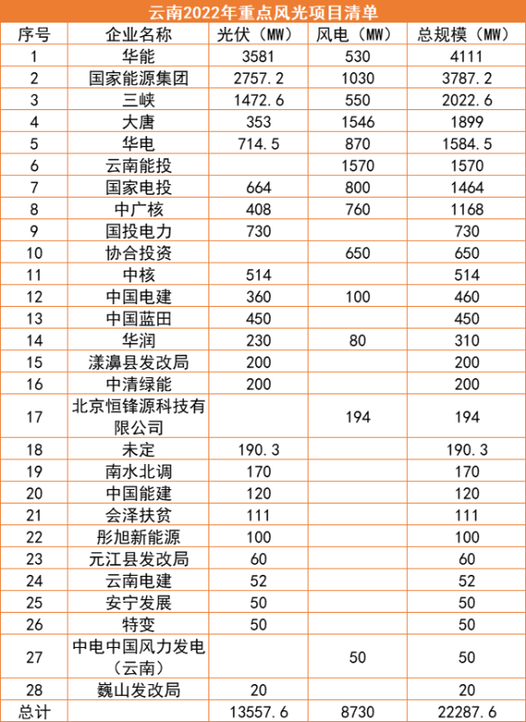 中國儲能網(wǎng)訊:6月18日,云南省發(fā)改委發(fā)布省級2022年重大項目清單以及2022年度“重中之重”項目清單,共涉及108個光伏電站項目以及38個風(fēng)電項目,其規(guī)模分別為13.5GW、8.7GW,總計為22.3GW。