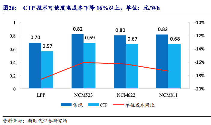 在2020年新時代證券的一份研報的測算中,數(shù)據(jù)顯示 CTP技術(shù)可以使得車用度電成本下降16%。