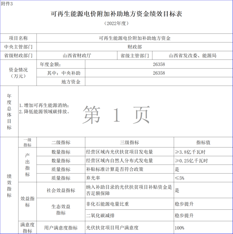 五、為保障資金安全,提高資金使用效率,電網(wǎng)企業(yè)應按年度對補貼資金申請使用等情況進行全面核查,必要時可聘請獨立第三方,同時做好績效自評。電網(wǎng)企業(yè)應在6月30日前將2021年及以前年度補貼資金撥付情況報送至國家可再生能源信息管理中心。統(tǒng)計信息包括項目代碼、項目名稱、項目業(yè)主、裝機容量、上網(wǎng)電價、補貼強度、撥付金額等。為深入貫徹落實《中共中央 國務院關于全面實施預算績效管理的意見》,切實提高財政資金使用效益,請你單位有關部門在組織預算執(zhí)行中對照績效目標(附件3)做好績效監(jiān)控,確保年度績效目標如期實現(xiàn)。同時,你單位應按規(guī)定及時上報績效自評結果,績效自評結果將作為分配預算資金的重要依據(jù)。