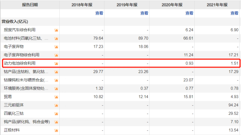 但是公司精心布局近六年的動(dòng)力電池回收業(yè)務(wù)占比不足1%?拆分2021年公司營(yíng)收占比,公司動(dòng)力電池回收業(yè)務(wù)營(yíng)業(yè)收入1.51億元,同比增長(zhǎng)61.63%,卻僅占總營(yíng)收的0.78%。