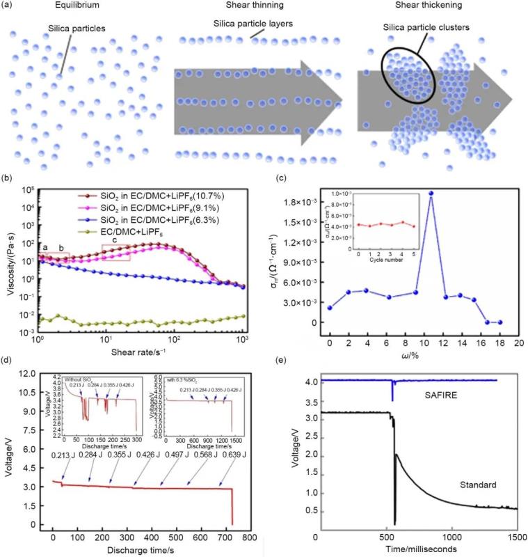 圖8 (a) 不同狀態(tài)下氣相二氧化硅顆粒在液體電解質(zhì)中的分布;(b) 不含SiO2的電解質(zhì)和含有6.3% SiO2、9.1% SiO2和10.7% SiO2的復(fù)合電解質(zhì)的流變圖;(c) 室溫下復(fù)合電解質(zhì)(SiO2/LiPF6/EC/DMC)離子電導(dǎo)率隨氣相二氧化硅質(zhì)量分?jǐn)?shù)的變化。插圖為含有9.1% SiO2的復(fù)合電解質(zhì)沖擊試驗(yàn)后的離子電導(dǎo)率;(d) LiFePO4電極在含9.1% SiO2的STF電解液中的放電曲線;(e) 是否使用剪切增稠電解液的電池電壓變化