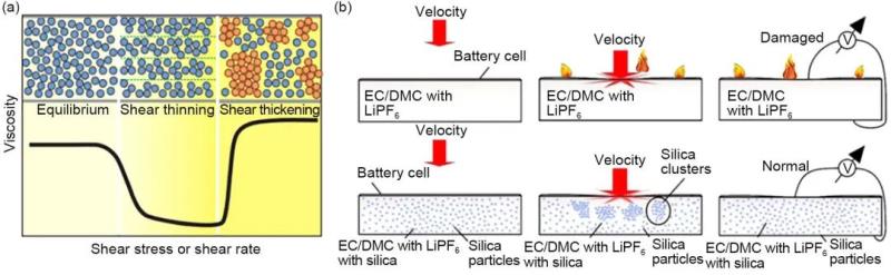 剪切增稠是一種非牛頓力學(xué)行為,即流體黏度隨剪切速率的增加呈現(xiàn)顯著和短暫的非線性增加。剪切增稠流體(STFs)是一種非牛頓流體,由剛性膠體粒子溶解在惰性載體溶液中形成,當(dāng)剪切速率超過臨界剪切速率時(shí),剪切黏度會(huì)急劇增加,保護(hù)受到動(dòng)態(tài)沖擊的鋰電池。