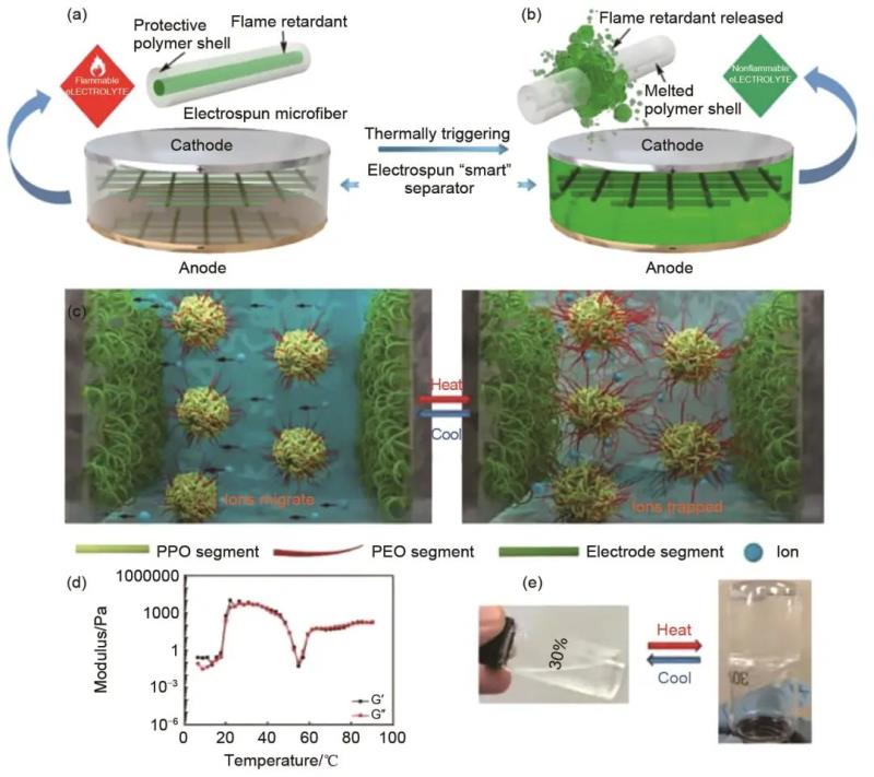 圖5 (a) 由芯殼結(jié)構(gòu)(阻燃劑為芯,聚合物為殼)組成的具有熱觸發(fā)阻燃性能的隔膜示意圖;(b) 熱觸發(fā)后,聚合物外殼熔化,封裝的阻燃劑釋放到電解液中,有效地抑制了電解液的著火和燃燒;(c) 溶膠-凝膠轉(zhuǎn)變示意圖(加熱時(shí)熱塑性彈性體溶液由溶膠態(tài)轉(zhuǎn)變?yōu)槟z態(tài),抑制離子的運(yùn)動(dòng),在高溫下主動(dòng)關(guān)閉設(shè)備);(d) 30% Pluronic溶液的流變行為隨溫度的變化;(e) 溶膠和凝膠狀態(tài)下的Pluronic溶液