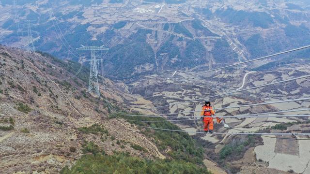 2022年1月23日,海拔2600多米,四川大涼山腹地,涼山彝族自治州美姑縣合姑洛鄉(xiāng)合姑洛村,白鶴灘-江蘇±800千伏特高壓直流輸電工程川1標段放線施工現(xiàn)場,來自國網(wǎng)四川電力送變電建設(shè)有限公司的電力工人正在高空走線。盧忠東 攝