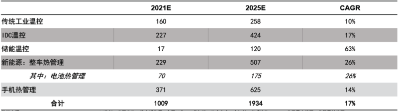 國信證券預測,綜合考慮傳統(tǒng)工業(yè)溫控、IDC機房溫控、儲能溫控、新能源車熱管理及手機溫控空間,預計2025年溫控市場有望超過1900億元,其中,儲能溫控市場規(guī)模預計可達120億元,復合年均增長率高達63%。