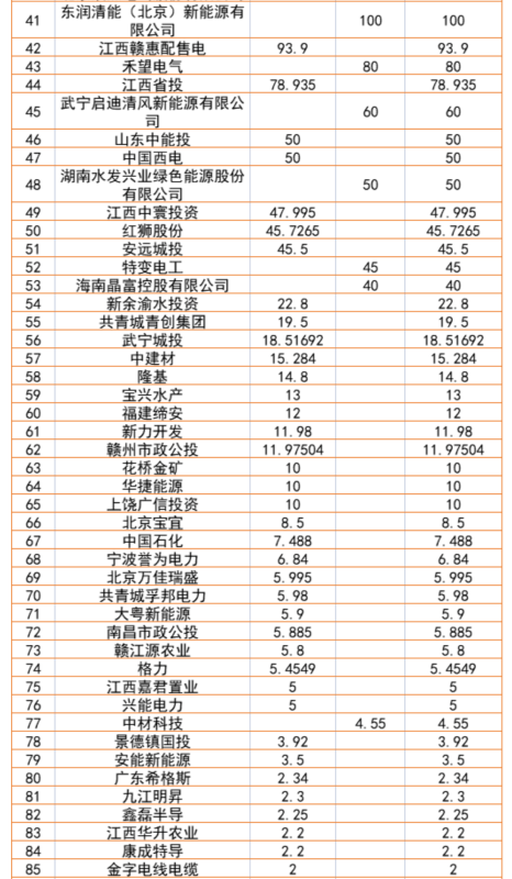 根據(jù)納入規(guī)劃的項(xiàng)目名單來(lái)看,華能、國(guó)家電投、國(guó)家能源集團(tuán)的規(guī)模進(jìn)入TOP3,幾乎均達(dá)到5GW以上,其次是三峽、大唐、贛能股份,民營(yíng)企業(yè)則由晶科、陽(yáng)光新能源領(lǐng)銜,GW級(jí)規(guī)模以上企業(yè)為7個(gè)。