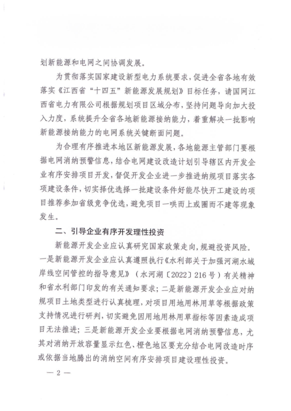 文件強(qiáng)調(diào),新能源開(kāi)發(fā)企業(yè)應(yīng)認(rèn)真遵照?qǐng)?zhí)行《水利部關(guān)于加強(qiáng)河湖水域岸線空間管控的指導(dǎo)意見(jiàn)》(水河湖〔2022〕216號(hào))有關(guān)精神和省水利部門印發(fā)的有關(guān)通知要求;二是新能源開(kāi)發(fā)企業(yè)應(yīng)對(duì)納規(guī)項(xiàng)目土地類型進(jìn)行認(rèn)真梳理,對(duì)項(xiàng)目用地用林用草等根據(jù)政策支持情況進(jìn)行研判,切實(shí)避免因用地用林用草指標(biāo)等因素造成項(xiàng)目無(wú)法推進(jìn);三是新能源開(kāi)發(fā)企業(yè)要根據(jù)電網(wǎng)消納預(yù)警信息,尤其對(duì)消納開(kāi)放容量顯示紅色、橙色地區(qū)要充分結(jié)合電網(wǎng)改造時(shí)序或依據(jù)當(dāng)?shù)仳v出的消納空間有序安排項(xiàng)目建設(shè)理性投資。