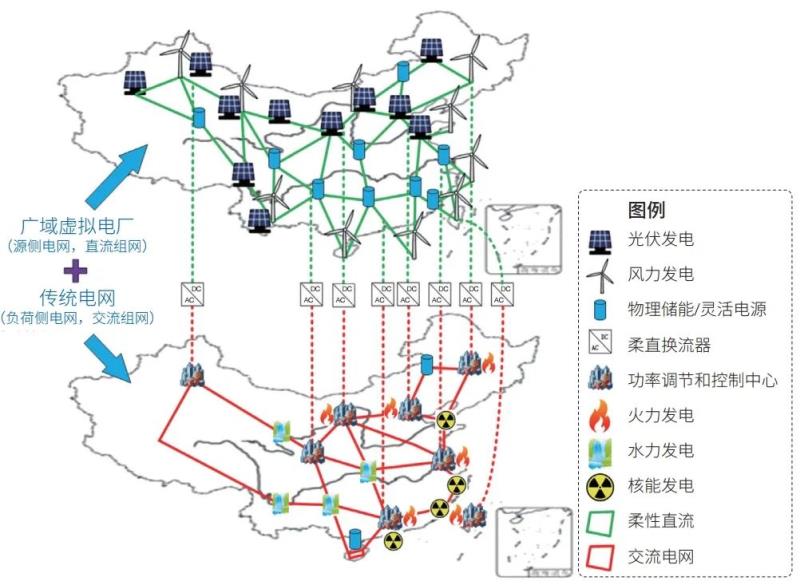1. 考慮到大量可再生能源按照傳統(tǒng)模式接入現(xiàn)有電網(wǎng)所帶來的系列挑戰(zhàn),可以構建覆蓋一個全國范圍內(nèi)統(tǒng)一的柔性直流電網(wǎng),將我國主要的光伏電站、風電場、部分物理儲能電站通過柔性直流換流器接入該電網(wǎng),以最大程度上利用廣域可再生能源的時空互補性,從而形成基于可再生能源的廣域源側電網(wǎng);該源側電網(wǎng)實際上也可以視為一個廣域虛擬電廠。