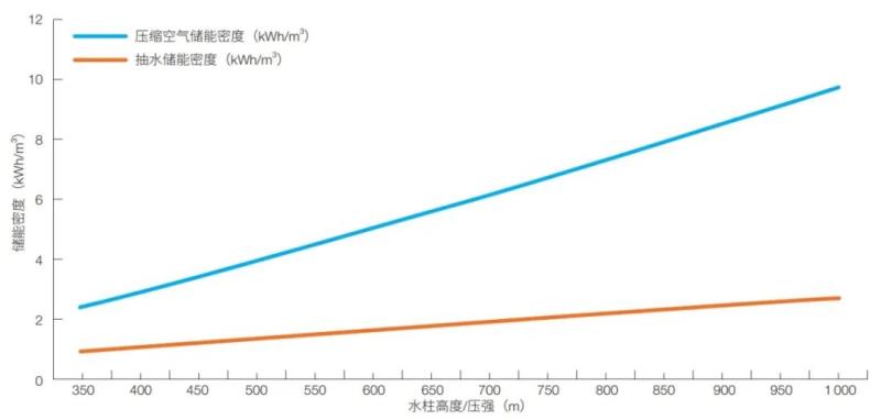 圖 1 抽水儲能與基于水壓補償?shù)膲嚎s空氣儲能系統(tǒng)的能量密度比較