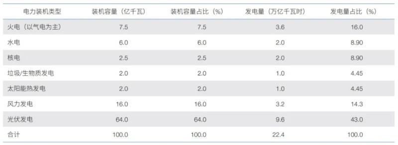 在上述光伏發(fā)電和風力發(fā)電總裝機中,假設光伏發(fā)電占比 80%(64 億千瓦)、風力發(fā)電占比 20%(16 億千瓦),可以得到如表 1 所示的 2060 年我國電源裝機及發(fā)電量預測表。