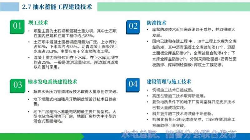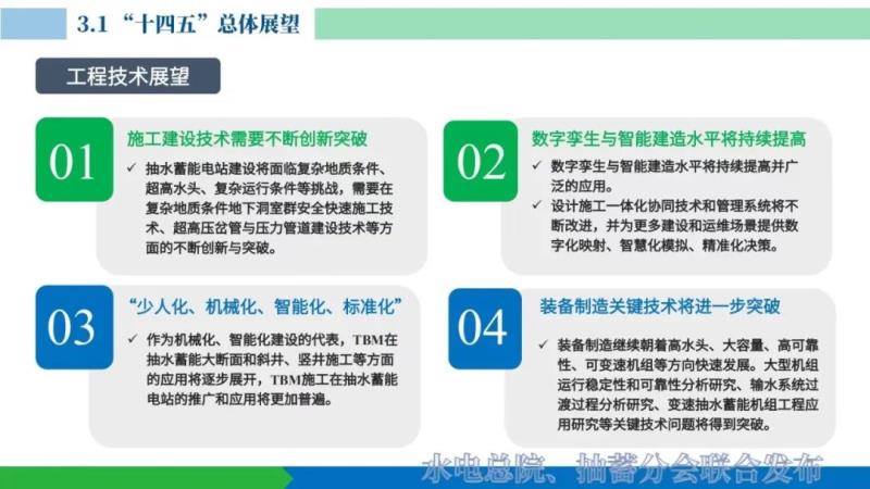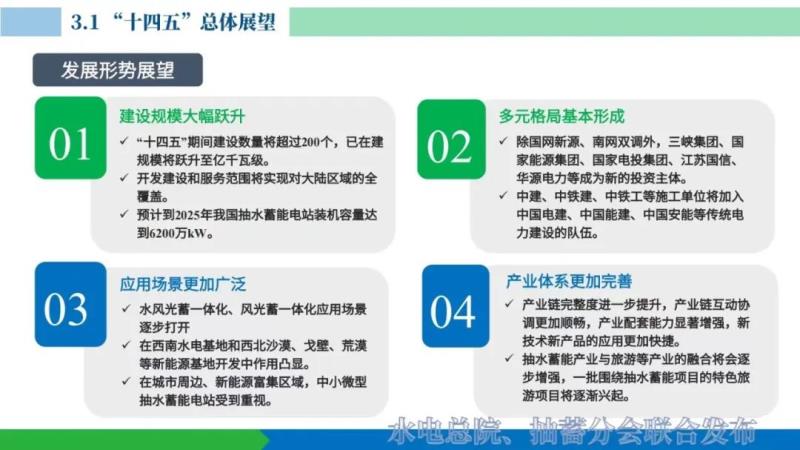 (3)應用場景更加廣泛。在傳統(tǒng)的應用場景基礎(chǔ)上,水風光蓄一體化,風光蓄一體化應用場景將逐步打開,抽水蓄能在西南水電基地和西北沙漠、胳膊、荒漠等大型新能源基地開發(fā)中儲能作用凸顯。在城市周邊、新能源富集區(qū)域,中小抽水蓄能電站、小微抽水蓄能電站的建設(shè)應用更加廣泛,多類型、多場景的抽水蓄能應用格局將逐步顯現(xiàn)。