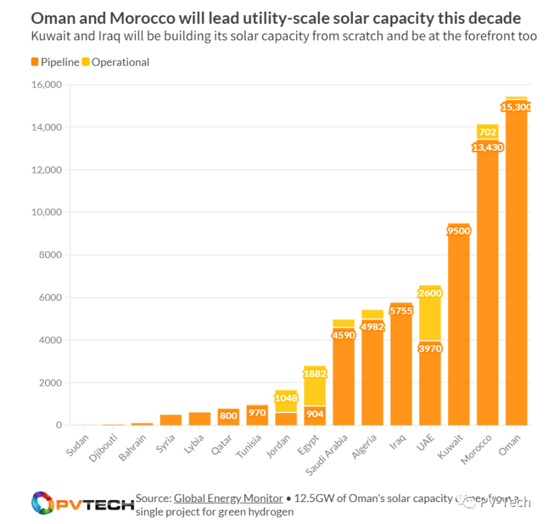 阿曼、摩洛哥和科威特公布的在開(kāi)發(fā)或在建項(xiàng)目已超過(guò)30GW,這些國(guó)家將在這十年中引領(lǐng)這一地區(qū)的大型地面光伏電站項(xiàng)目。
