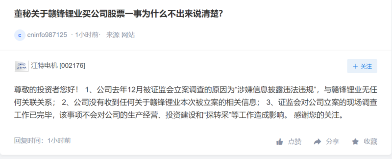 對(duì)此,江特電機(jī)7月4日早盤(pán)中在互動(dòng)平臺(tái)表示,公司去年12月被證監(jiān)會(huì)立案調(diào)查的原因?yàn)椤吧嫦有畔⑴哆`法違規(guī)”,與贛鋒鋰業(yè)無(wú)任何關(guān)聯(lián)關(guān)系;公司沒(méi)有收到任何關(guān)于贛鋒鋰業(yè)本次被立案的相關(guān)信息;證監(jiān)會(huì)對(duì)公司立案的現(xiàn)場(chǎng)調(diào)查工作已完畢,該事項(xiàng)不會(huì)對(duì)公司的生產(chǎn)經(jīng)營(yíng)、投資建設(shè)和“探轉(zhuǎn)采”等工作造成影響。