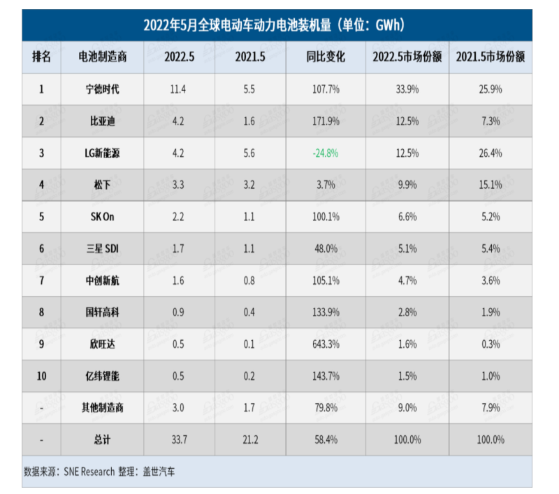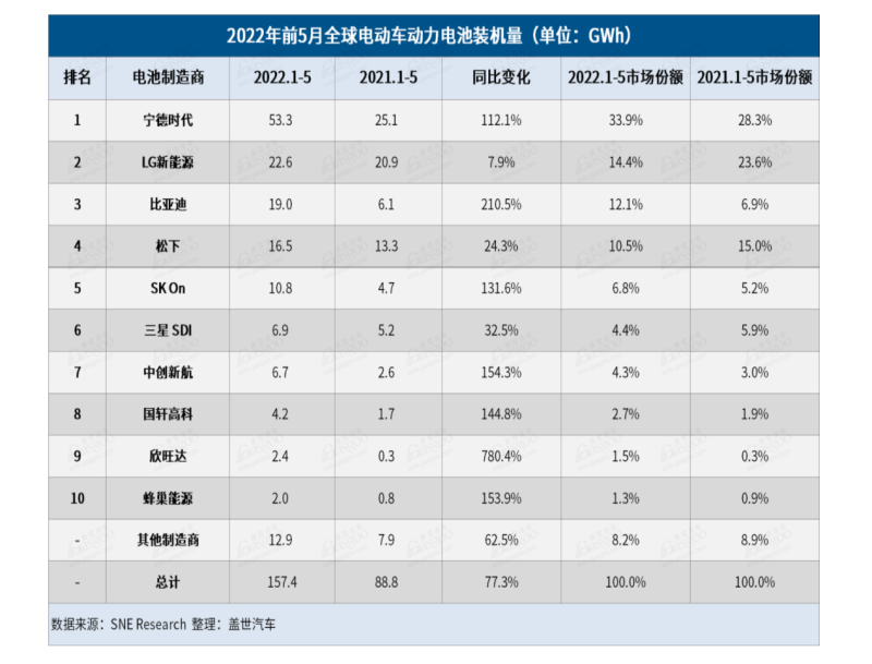 2022年1月至5月,全球電動(dòng)汽車電池裝機(jī)量為157.4 GWh,同比增長77.3%,維持了自2020年第三季度以來的持續(xù)增長趨勢。以寧德時(shí)代、比亞迪為首的一批中國電池企業(yè)以強(qiáng)勢增長的中國電動(dòng)汽車市場為后盾,領(lǐng)跑市場增長,而中創(chuàng)新航、欣旺達(dá)等大部分中國電池企業(yè)的市場份額都有所增加。