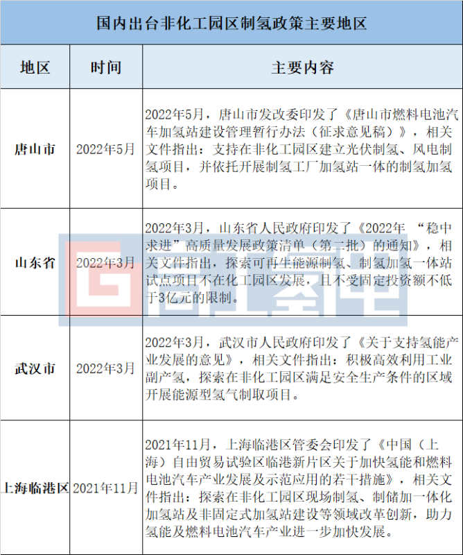 從相關(guān)政策內(nèi)容來看,山東省、上海臨港區(qū)和武漢市均為探索非化工園區(qū)制氫項目,而唐山市的政策則是明確(唐山市為征求意見稿)支持,態(tài)度更為積極。
