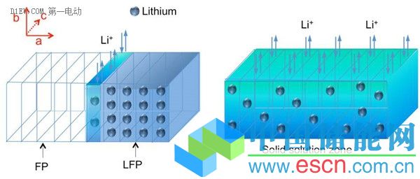 磷酸鐵鋰(LFP)電極充電或放電過程圖。由于鋰離子在充電過程中被分離,形成一個貧鋰磷酸鐵(FP)區(qū)域,但在兩者之間有一個固溶體區(qū)域(SSZ,暗藍綠色),這一區(qū)域包含有一些隨機分布的鋰原子,不同于鋰原子的原始結晶材料(淡藍色)中的有序數(shù)組。
