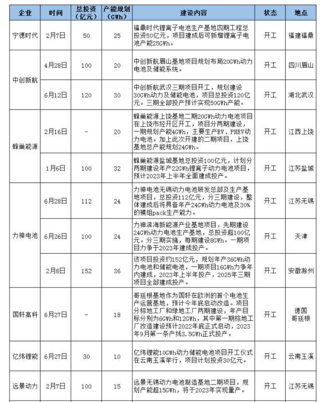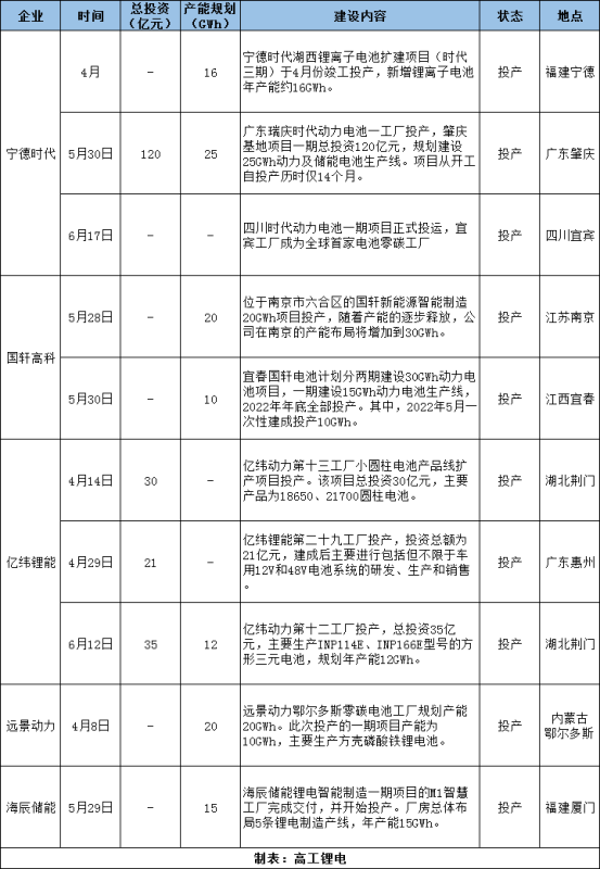 今年上半年,寧德時(shí)代湖西基地、肇慶基地、四川基地相繼投產(chǎn);國(guó)軒高科南京、宜春基地陸續(xù)投產(chǎn);億緯鋰能荊門、惠州等多個(gè)工廠也開始產(chǎn)能爬坡;遠(yuǎn)景動(dòng)力零碳電池工廠投產(chǎn)......