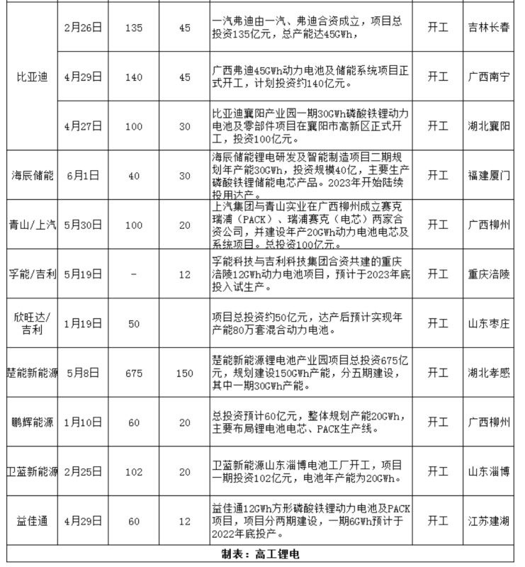 高工鋰電統(tǒng)計(jì)數(shù)據(jù)顯示,上半年動(dòng)力電池及儲(chǔ)能開工項(xiàng)目22個(gè),總產(chǎn)能規(guī)劃超638GWh。與上一輪開工潮相比,今年動(dòng)力電池企業(yè)同時(shí)啟動(dòng)多個(gè)基地同步建設(shè)。中創(chuàng)新航眉山、武漢基地,蜂巢能源上饒、鹽城基地,力神無(wú)錫、滁州、天津基地,比亞迪長(zhǎng)春、南寧、襄陽(yáng)基地等均在短期內(nèi)陸續(xù)開工。